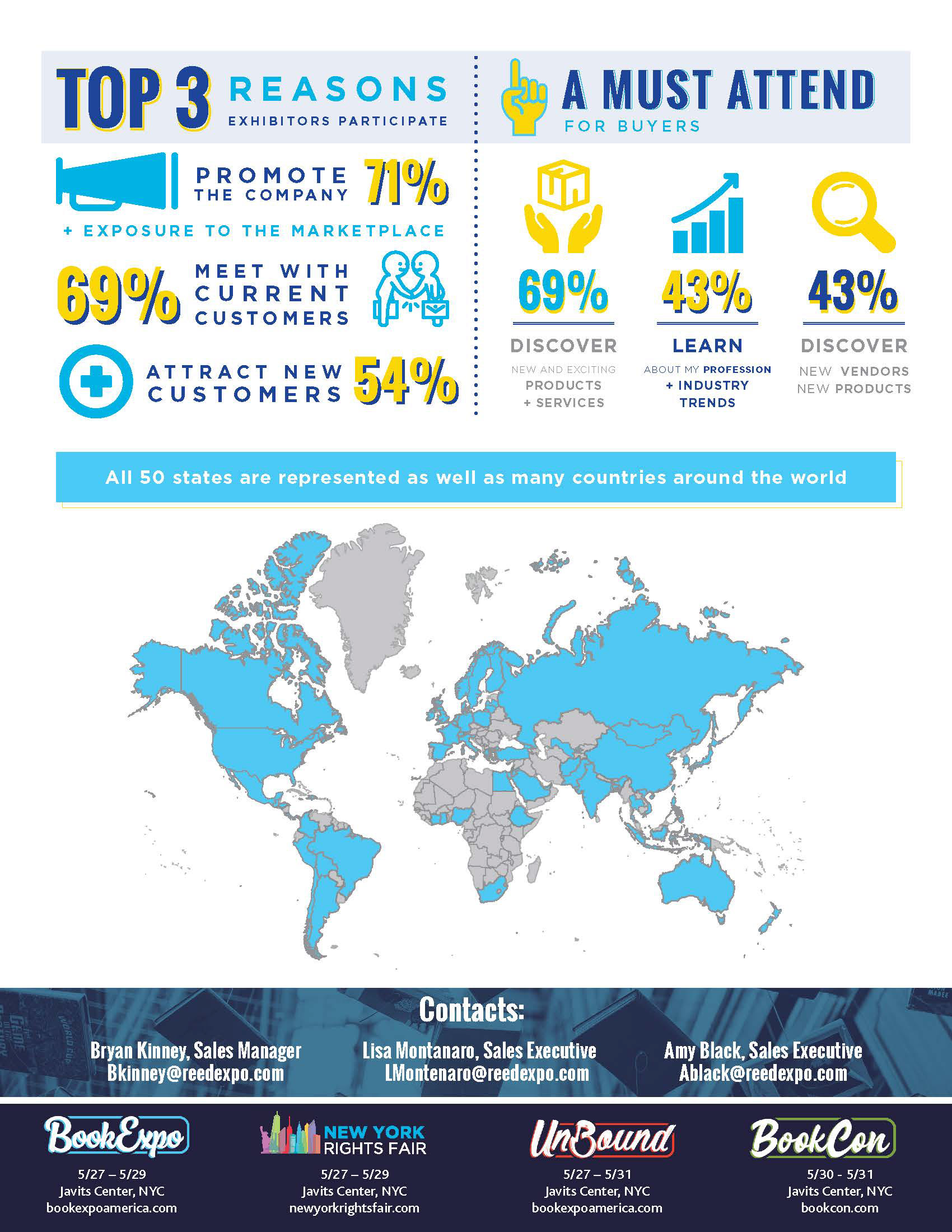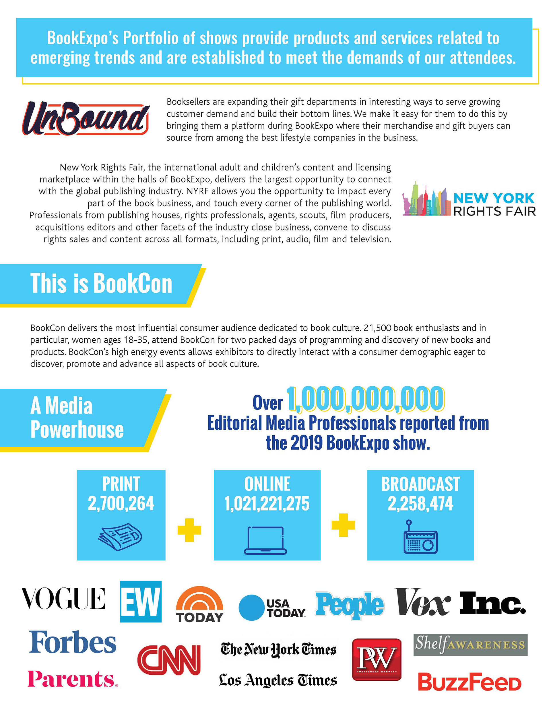 This is an infographic I made for the Book Expo/Book Con team after they went through a new rebrand and wanted an infographic of the general attendance stats, audience, and media presence in the new branded design, new logo and new colors.