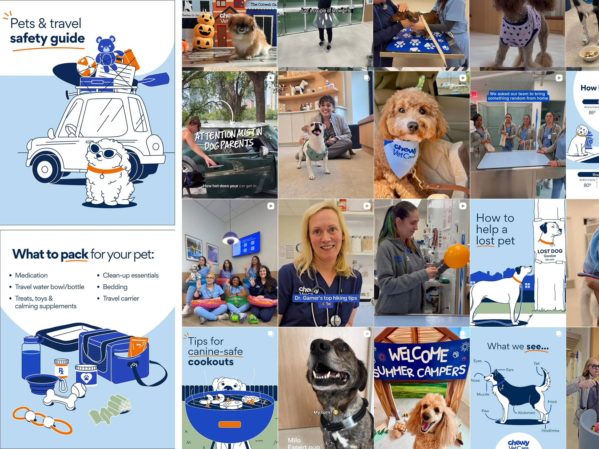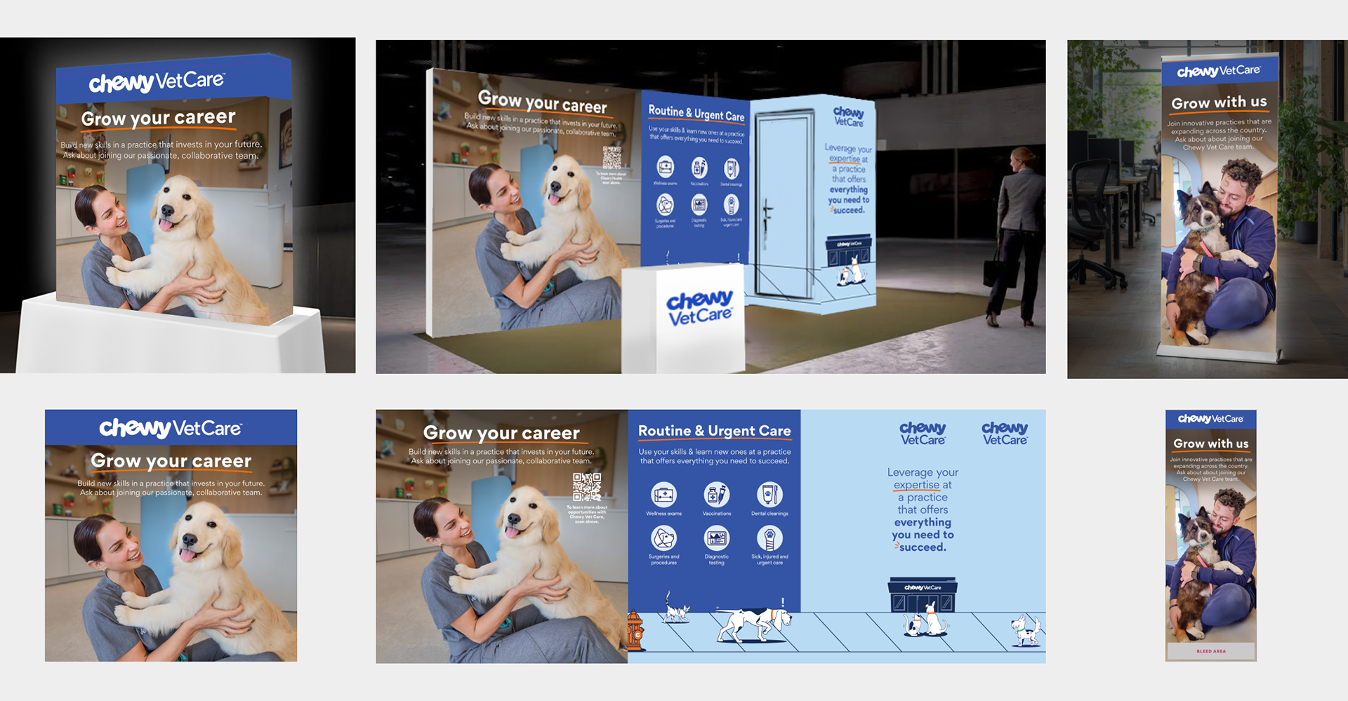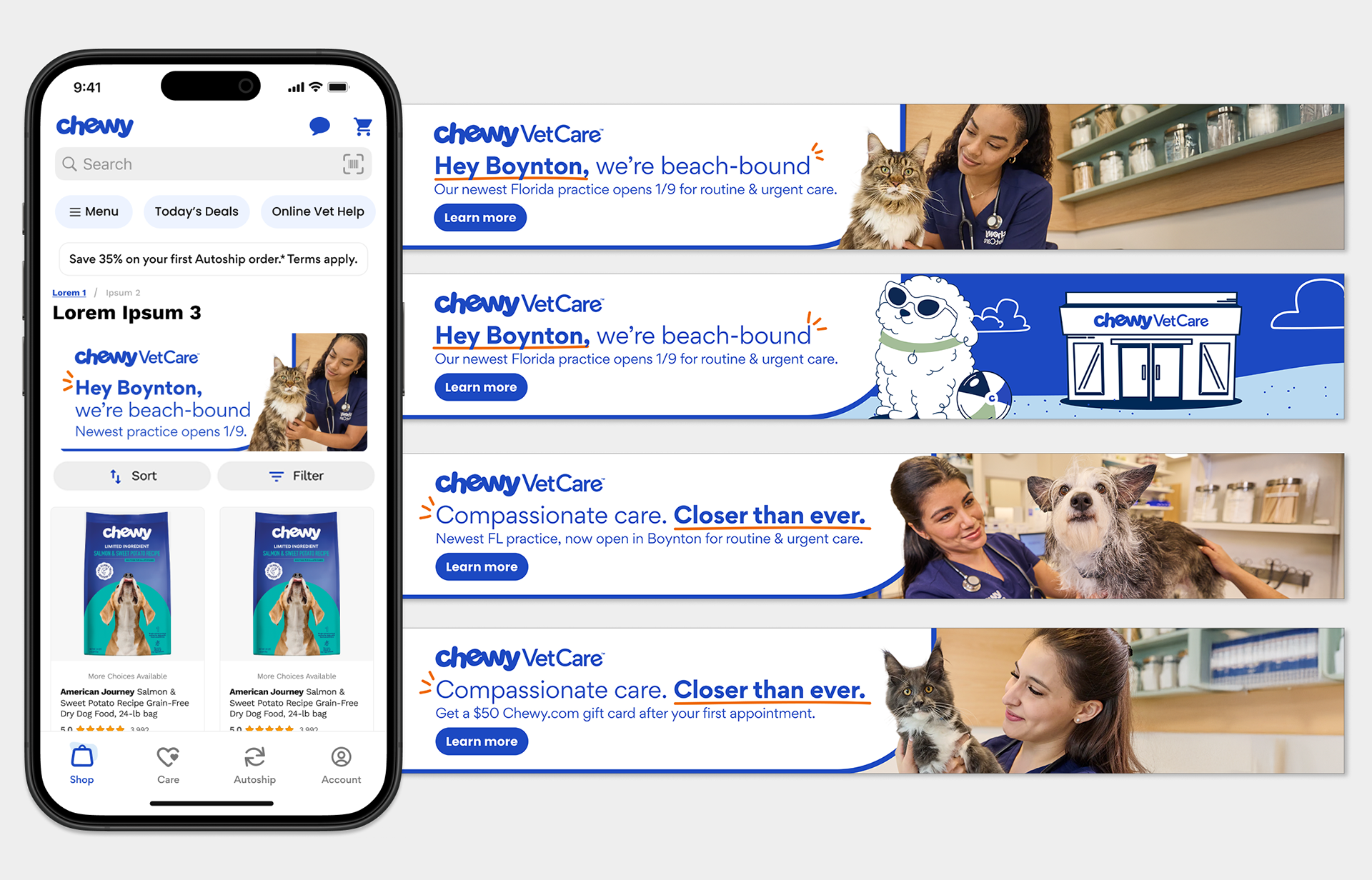 My first task at Chewy was to lead and manage the design for the launch of Chewy's growing business, Chewy Vet Care. Working with a small but mighty team, including one copy writer and one PM, we handle launch assets including physical location signage, email, paid social, out-of-home campaigns, direct mail, site assets for Chewy.com, and every little sticker and doodad that comes with a vet clinic opening. Including cutesy photo opportunities for the visiting furry friends.
