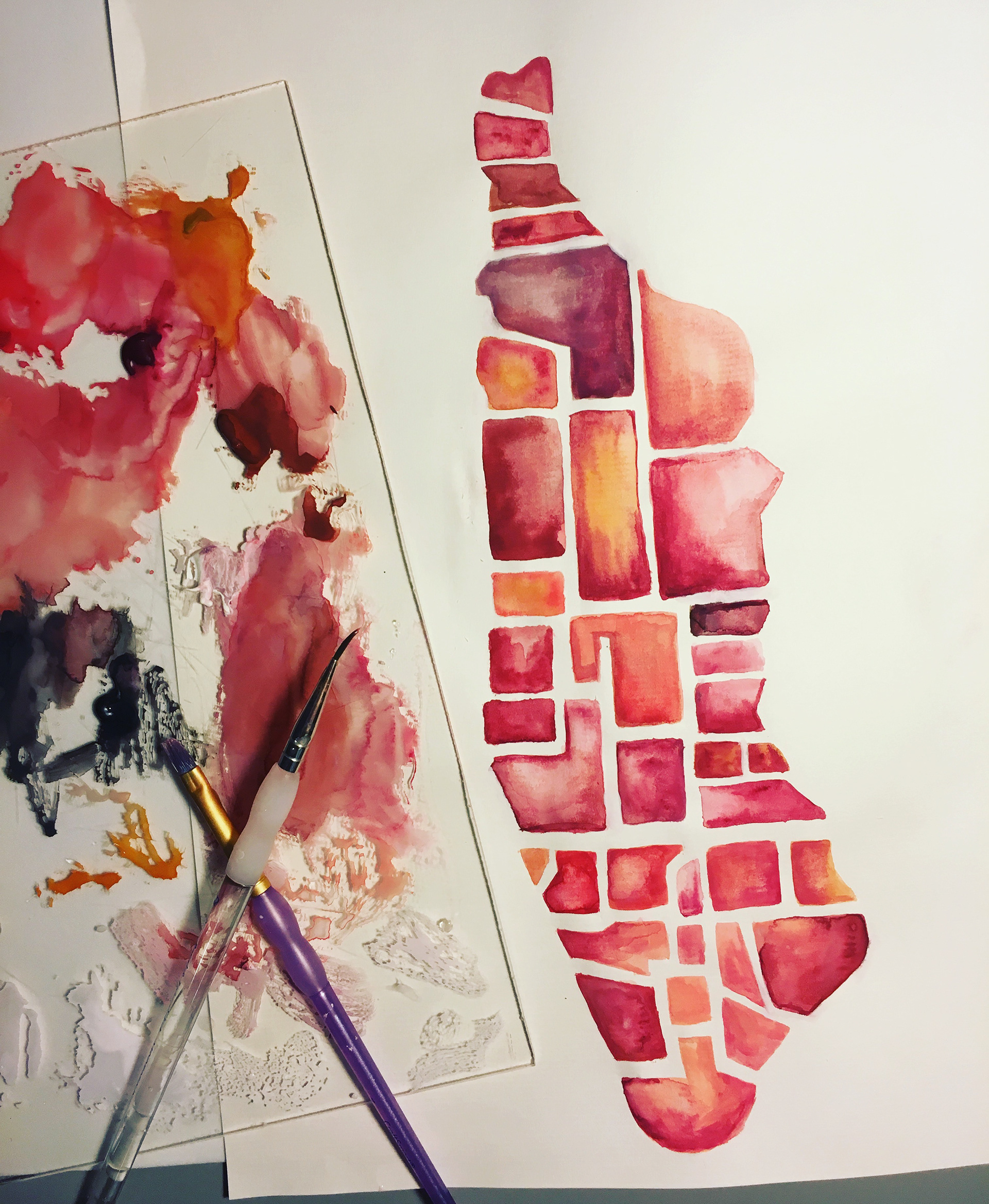 This piece is in a series of watercolor that I have started. The pieces are focused on cities either using their street grids as a blocking mechanism, or separated into the different neighborhoods of the city. Some pieces have the different neighborhoods color coded to differentiate between them, or the entire piece is in a single color scheme.