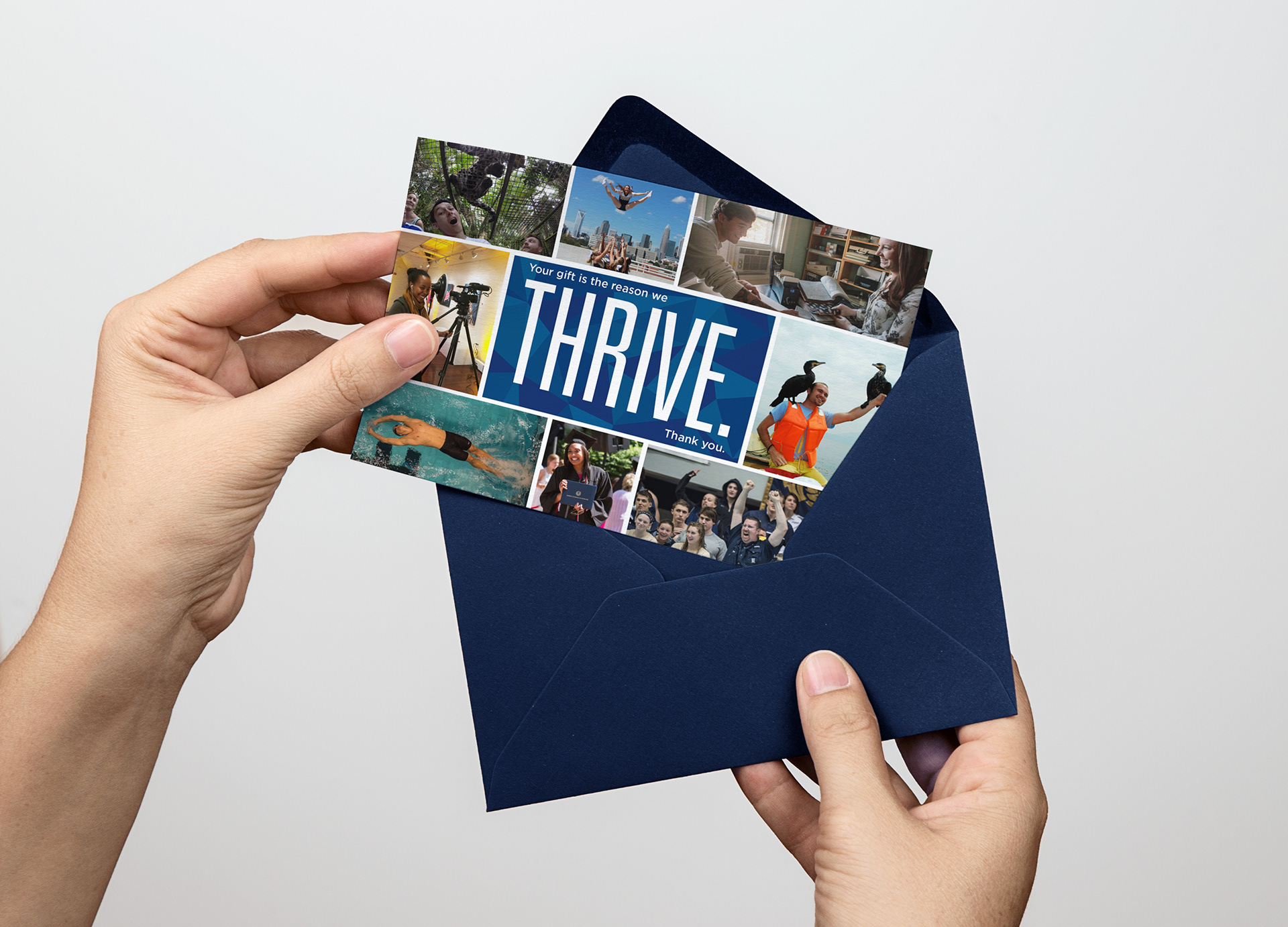 These design were made to be given to Alumni who had donated to the school. There were two different designs, the first was a collage that we wanted to embody the Queens experience. Second, a general thank you card that can be used anytime someone donates. It is simply, clean and can work for multiply occasions.